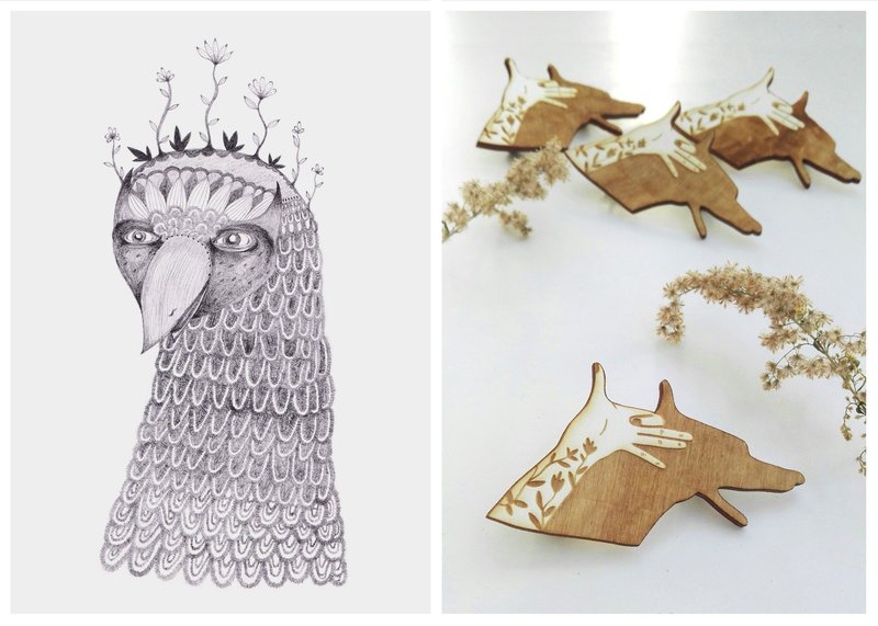 Eläinaiheita ja yksityiskohtia! Myyn originaalitaidettani printtien, pienlehtien sekä postikorttien muodossa. Lisäksi pöydältä löytyy laaja valikoima puisia pinssikoruja, kangastuotteita, avaimenperiä ja tarroja.