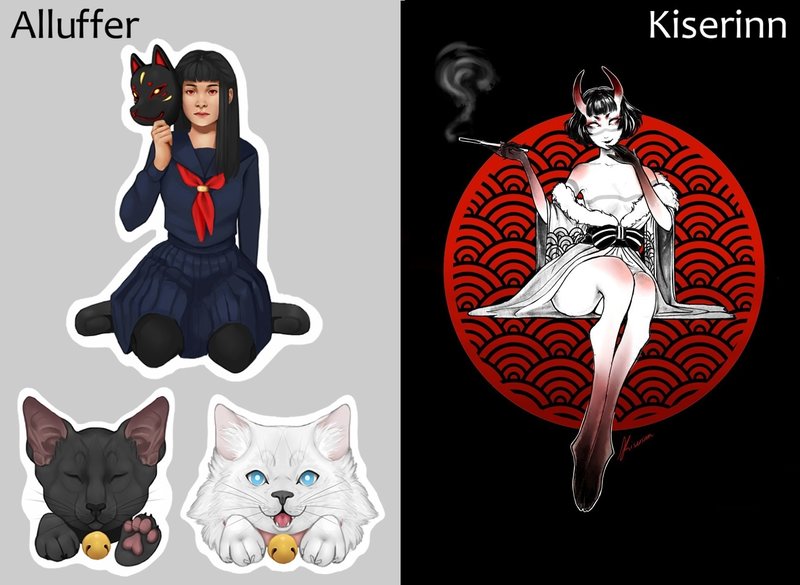 Kiserinn: Pöydältäni löytyy fanitaidetta sekä originaalitöitä printteinä sekä tarroina, ja niitä löytyy monessa eri koossa. Sarjoista hyvin edustavat esimerkiksi studio ghiblin työt ja originaalitöitä inspiroivat mm. eläimet ja luonto!