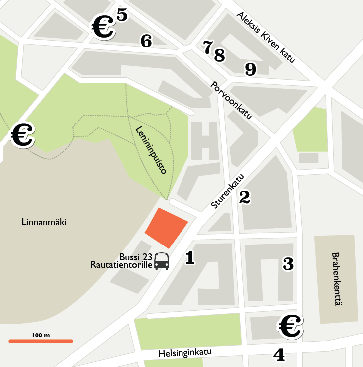 Katso tästä lähimmät pysäkit ja lähiliikenteen bussi- ja raitiovaunulinjat, joilla kätevimmin pääset paikalle.