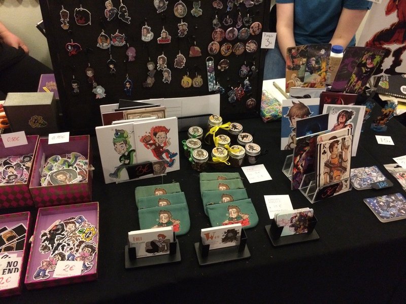Pöydästämme löytyy tuotteita kolmelta eri artistilta, joten jokaiselle löytyy jotakin! Myynnissä on hyvälaatuisia printtejä, kortteja, kännykkäkoruja, lompakoita ynnä muuta pientä kivaa. Tavaraa löytyy useasta eri fandomista, originaaleja tuotoksia unohtamatta!