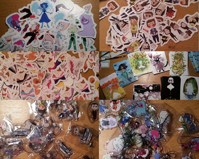 Kiserinn: Pöydänpuolikkaaltani löytyy erilaisia fanart- ja originaalitöitä printtien, tarrojen ja charmien, sekä mahdollisesti kangaskassien ja muutamien canvastaulujen muodossa! Sarjoina ovat mm. Steven Universe, Tokyo Ghoul ja Love Live ଘ(੭ˊᵕˋ)੭:・゚✧