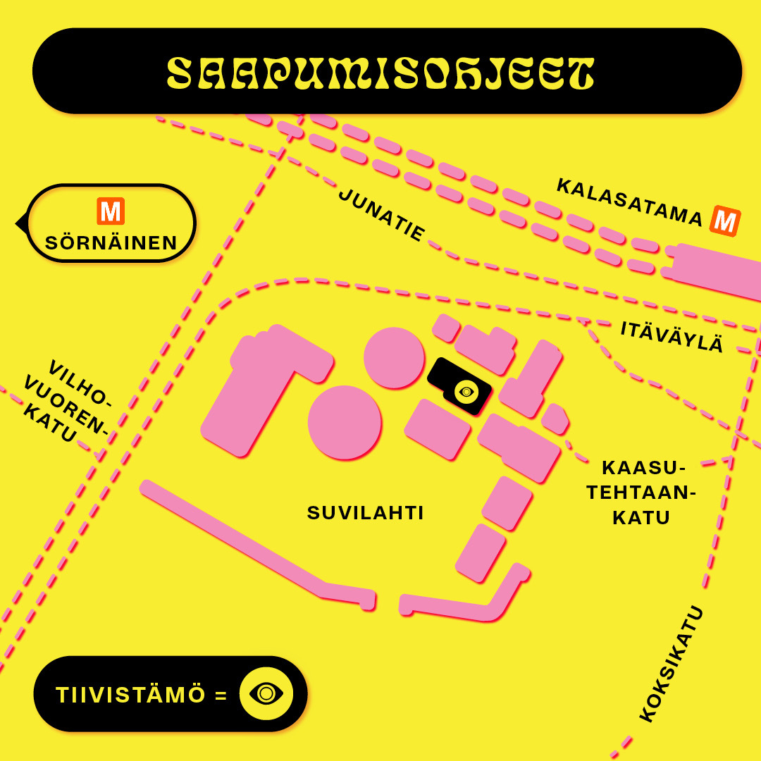 Tapahtumapaikkaan nähden lähin metroasema on Kalasatamassa (noin 350 metriä), mutta myös Sörnäisistä kävelee paikalle noin 10 minuutissa. Suvilahteen pääsee kätevästi myös bussilla tai Pasilasta raitiovaunulinjalla 13. Kotiin päin lähtiessä huomaathan, että metro lopettaa liikennöinnin jo ennen puolta yötä! Lisätietoja saapumisesta löydät Tiivistämön sivuilta.