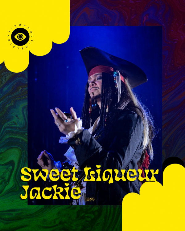 Burleski- ja dragtaitreilija Sweet Liqueur Jackie tuo Popcult Nightsin lavalle drag king -numeronsa Jack Sparrowsta. Tältä veijarilta taitaa taas olla rommi lopussa, eikä kukaan voi tietää, mitä hän keksii seuraavaksi.